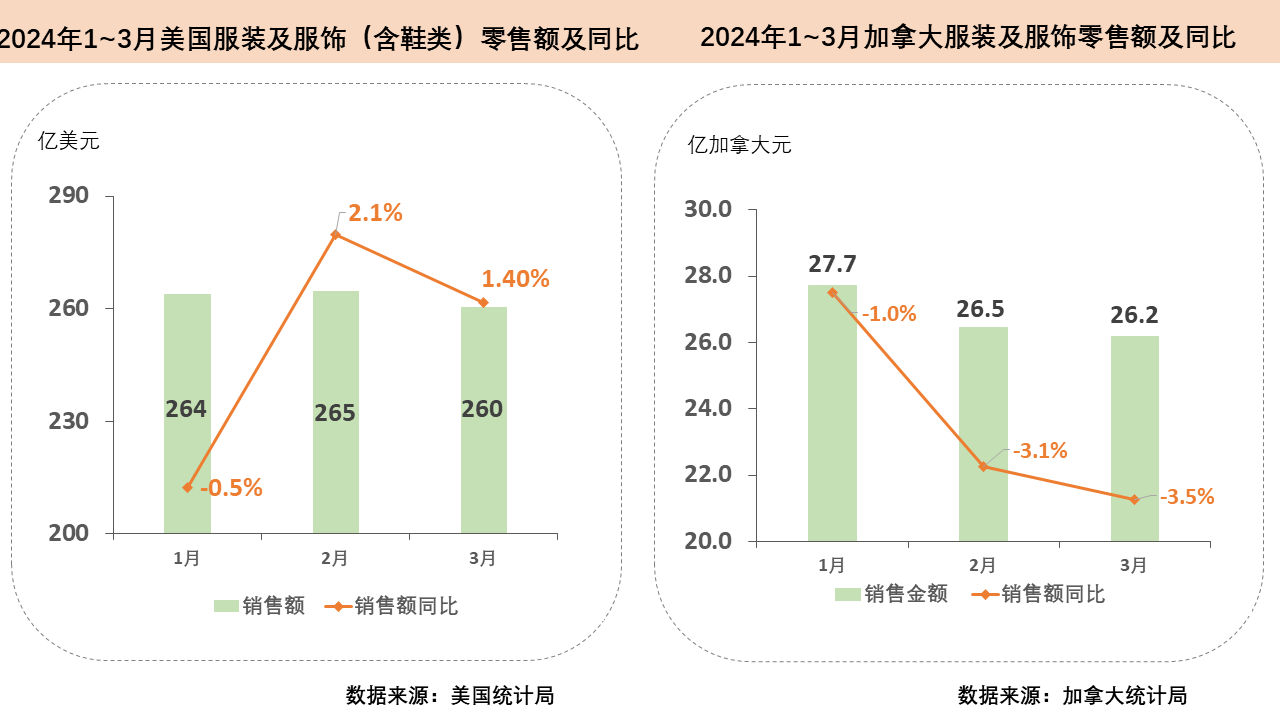 加拿大市場趨於疲弱。受過去兩年持續加息影響,加拿大民眾消費態度更為謹慎,人均消費支出降低。今年3月,加拿大整體零售額同比增長1.9%至664.4億加元(約486.2億美元),環比減少0.2%,九大子行業中包括家具、電子產品、服裝及配飾在內的七大子行業當月零售額均有下降。一季度,加拿大服裝及配飾零售額呈逐月下降趨勢,3月當月加拿大服裝及配飾零售額達26.2億加元(約19.2億美元),同比減少3.5%,環比減少1%。