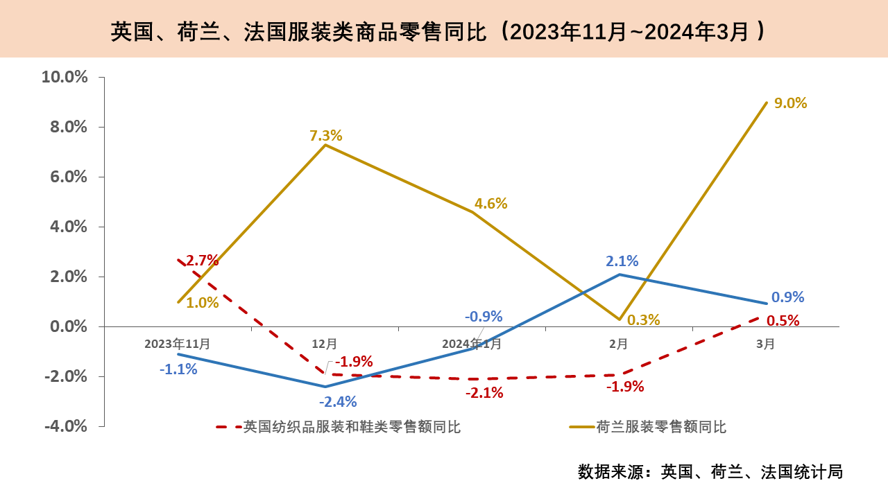 荷蘭服裝零售保持正增。2024年一季度,荷蘭GDP同比下降0.1%,與上個季度相比,增速由正轉負。同期,荷蘭服裝零售額基本保持穩定增長,前三個月同比增速分別為4.6%、0.3%和9%,推動了整體零售額的上升。