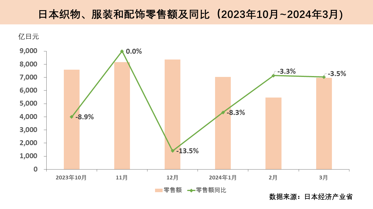 今年一季度,日本織物、服裝和配飾零售額達19480億日元(約124.3億美元),同比減少5.2%。其中,1月服裝相關零售額同比下降8.3%;2月同比減少3.3%,環比大幅下降22.2%;3月同比減少3.5%,環比增長27.6%。