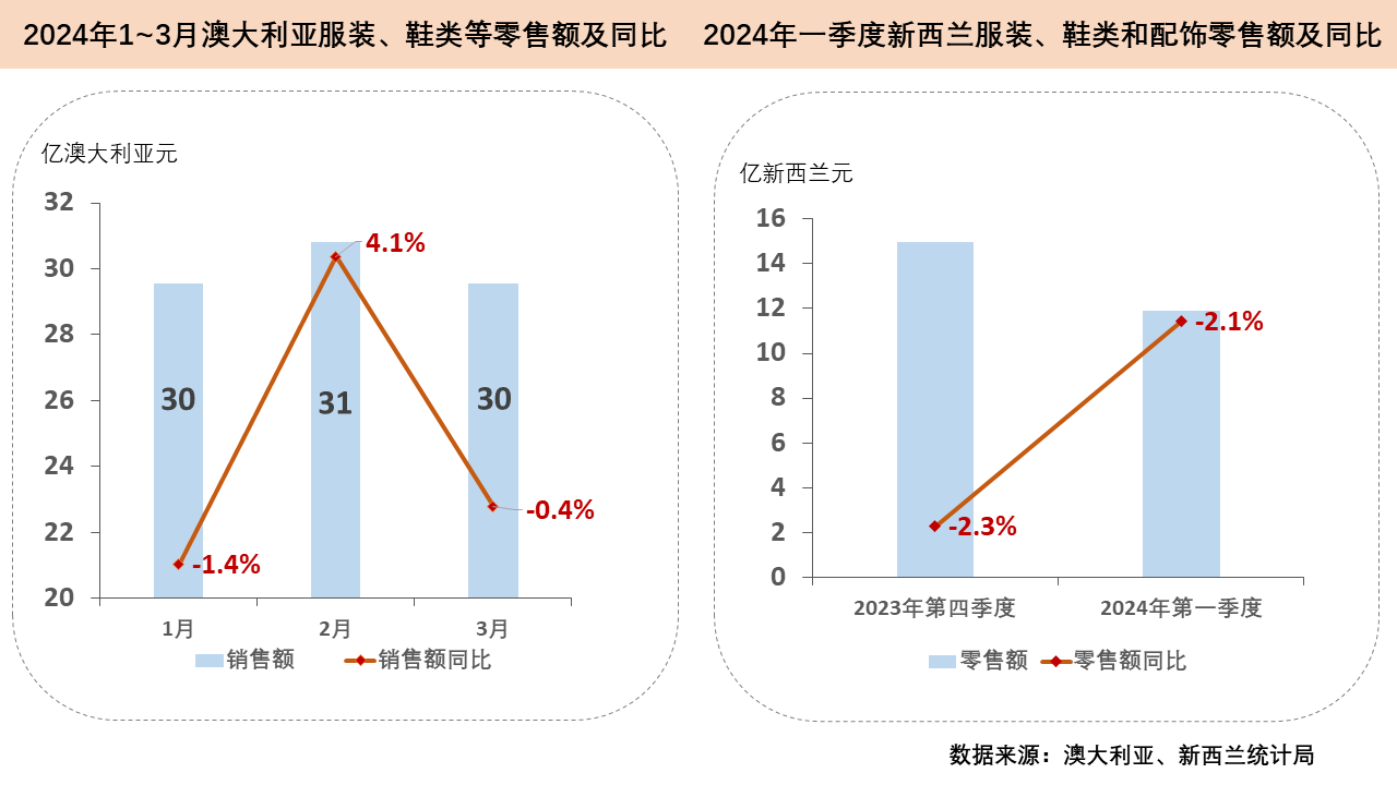 新西蘭市場尚未恢複。根據新西蘭統計局數據顯示,今年一季度新西蘭通脹率由去年第四季度的4.7%降至4%,為近三年來最低水平,但高物價水平對消費的抑製作用仍未消散。同期,新西蘭服裝、鞋類和配飾零售額為11.9億新西蘭元(約7.3億美元),同比減少2.1%。