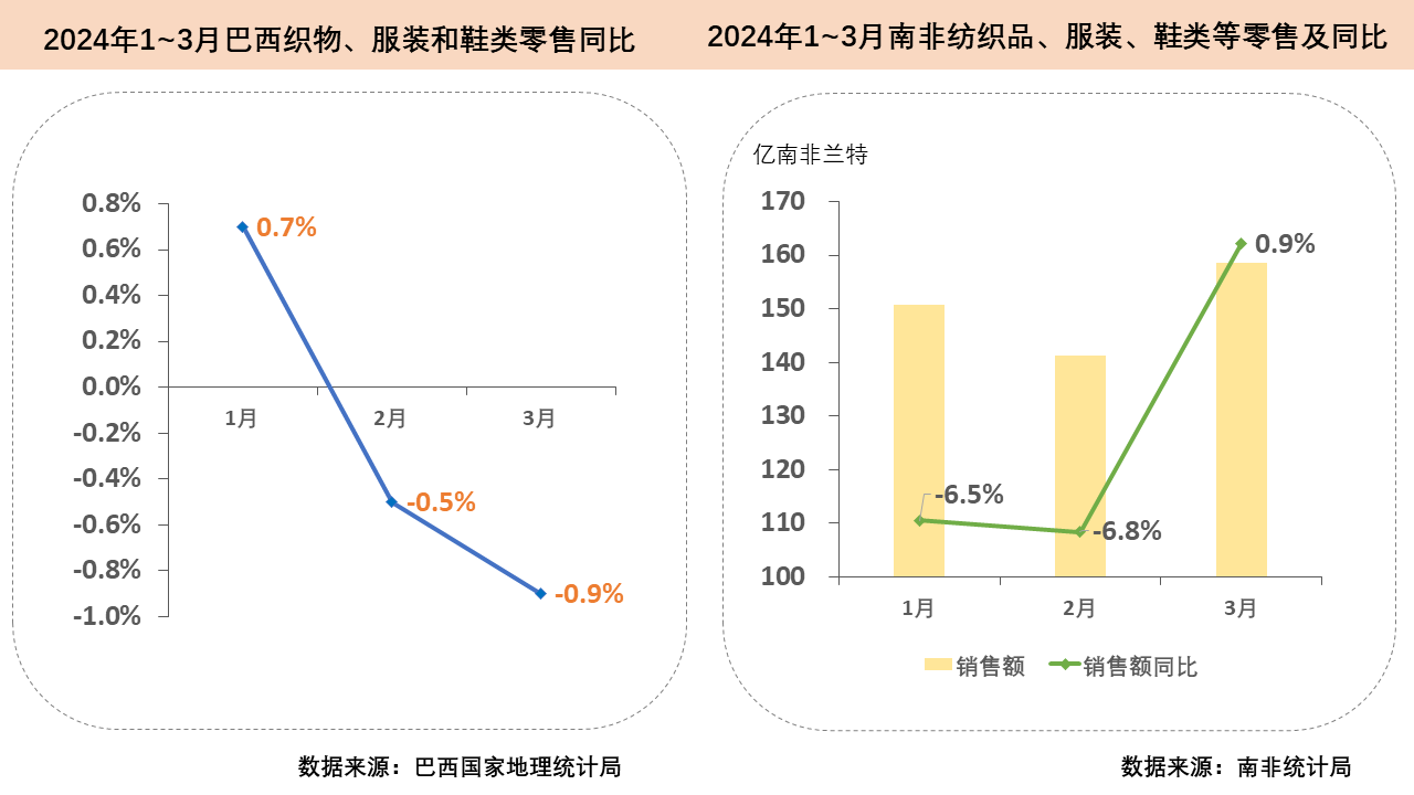 今年4月,南非通脹率達5.2%,已連續三月放緩,但仍高於南非央行設定的目標。一季度南非紡織品、服裝、鞋類和皮製用品零售表現不佳,1至2月南非紡織品服裝相關零售額同比分別下降6.5%和6.8%,3月略有回升,零售額達158.6億蘭特(約8.6億美元)。