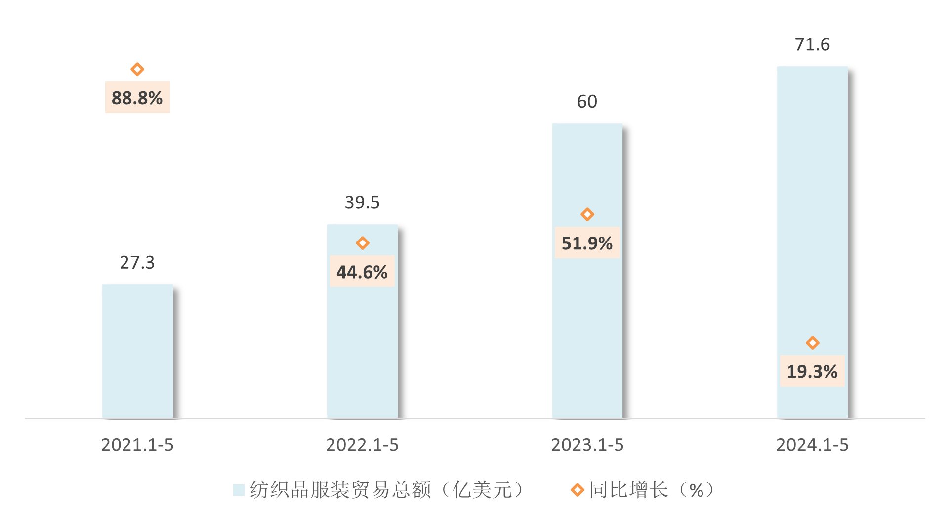 圖1 2021~2024年同期我國與(yu) 中亞(ya) 五國紡織品服裝貿易總額統計