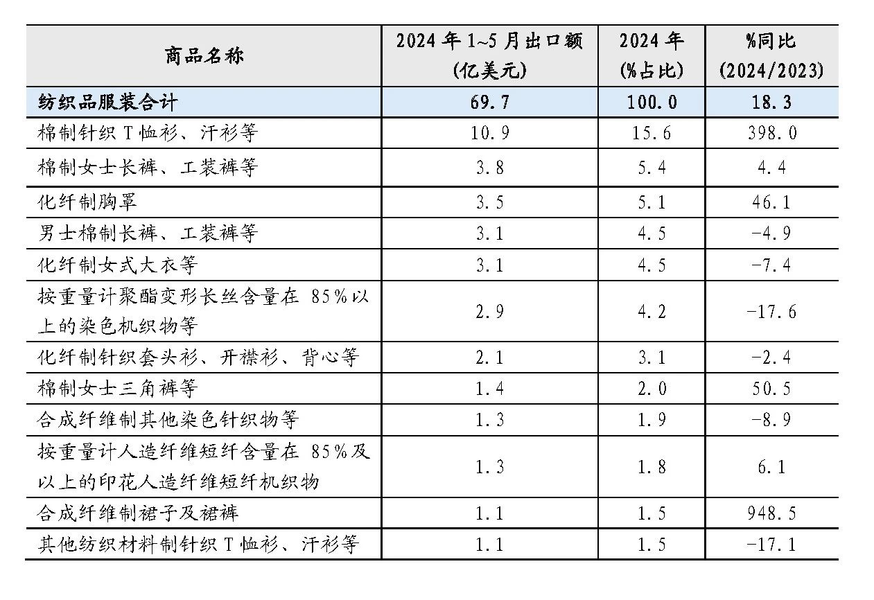 表1 2024年1~5月我國對中亞(ya) 國家主要紡織品服裝出口統計