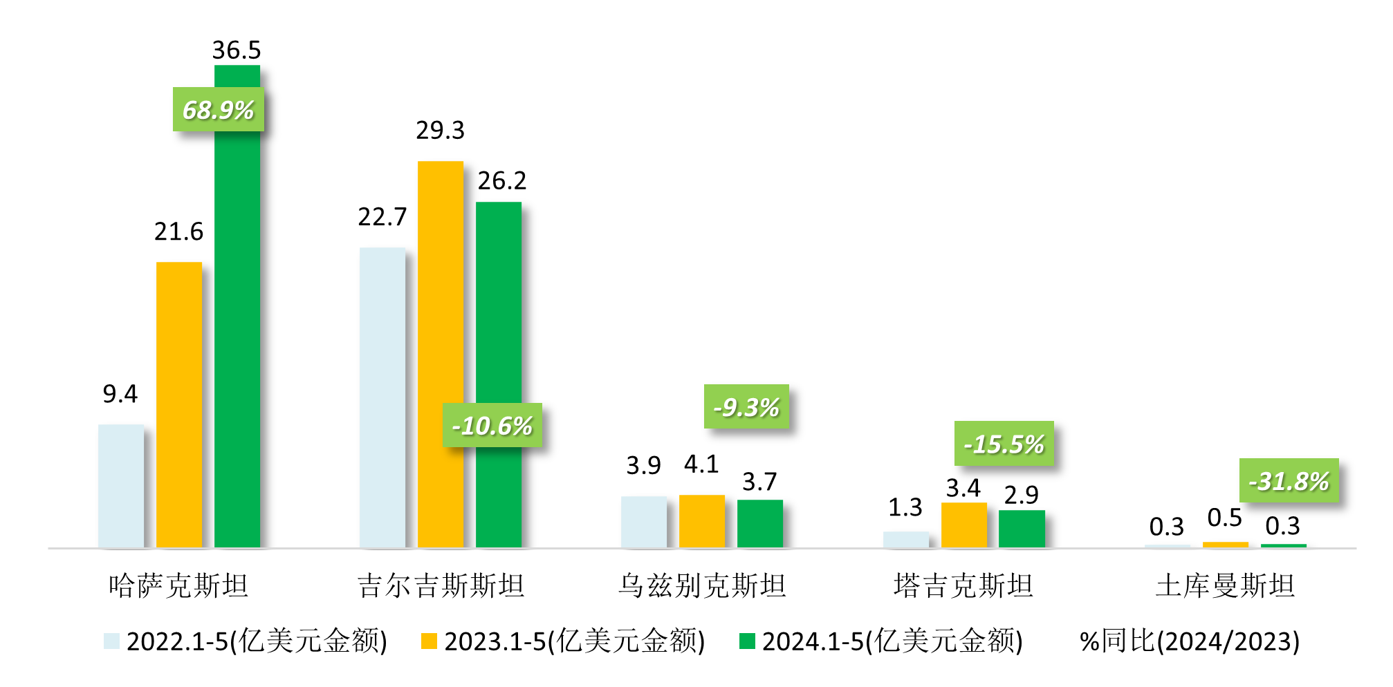 圖2 2024年1~5月我國對中亞(ya) 五國出口紡織品服裝情況