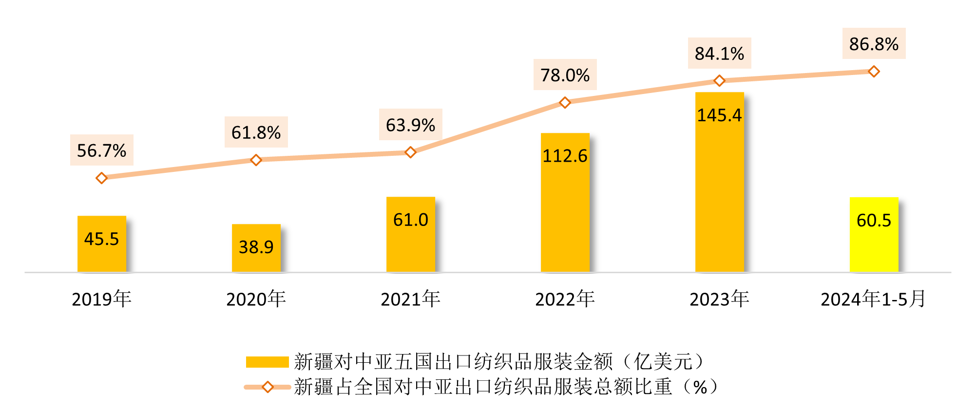 紡織品服裝是新疆與中亞國家間貿易高質量發展的重要支撐點之一。1~5月,新疆對中亞國家紡織品服裝出口額為60.5億美元,約占新疆對中亞出口總額的40%以上,出口額同比增長26.9%,高於新疆對中亞出口總額增速近6個百分點。同時,新疆是我國對中亞出口紡織服裝產品金額最大的省級行政區,今年1~5月新疆紡織品服裝出口額約占我國紡織行業對中亞出口總額的87%,份額逐年穩步提升。