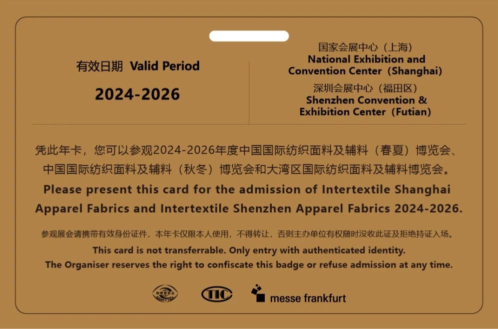 intertextile麵輔料展貴賓買(mai) 家年卡 是intertextile麵輔料展主辦方為(wei) 專(zhuan) 業(ye) 觀眾(zhong) 提供的特別服務,卡片權益自申請成功之日起即刻生效,直至2026年12月31日截止。在2024至2026年三年內(nei) ,持卡觀眾(zhong) 可憑此卡參觀2024-2026年度中國國際紡織麵料及輔料(秋冬)博覽會(hui) 、中國國際紡織麵料及輔料(春夏)博覽會(hui) 、大灣區國際紡織麵料及輔料博覽會(hui) ,並享受主辦方為(wei) 您提供的係列專(zhuan) 屬服務。