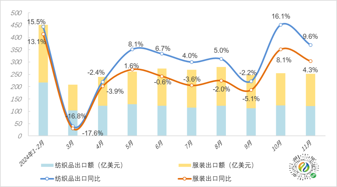 根據海關總署今日統計快訊,今年1~11月,全國紡織品服裝出口2730.6億美元,同比增長2.0%,增幅較前十個月擴大0.5個百分點。其中,紡織品出口1288.4億美元,同比增長4.6%;服裝出口1442.2億美元,同比微降0.2%。