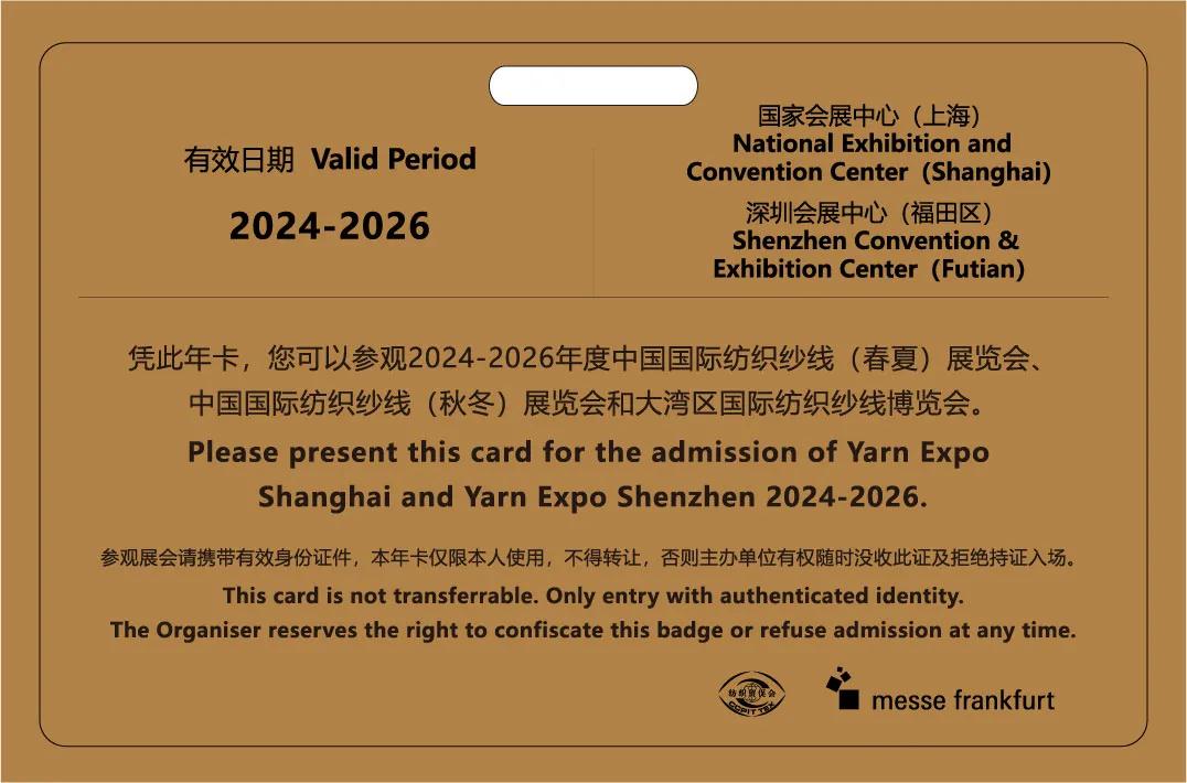 Yarn Expo紗線展貴賓買(mai) 家年卡是Yarn Expo紗線展組委會(hui) 為(wei) 專(zhuan) 業(ye) 觀眾(zhong) 提供的特別服務。貴賓買(mai) 家年卡三年為(wei) 一個(ge) 有效周期,本周期即在2024至2026年三年內(nei) ,持卡觀眾(zhong) 可憑此卡參觀2024-2026年度、大灣區國際紡織紗線博覽會(hui) 、,並享受主辦方為(wei) 您提供的係列專(zhuan) 屬服務。