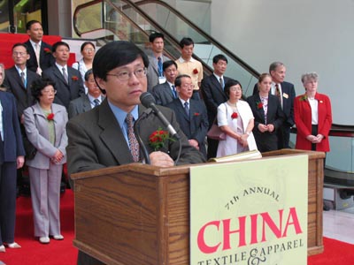 值2006年第7屆"中國紡織品服裝貿易展覽會(hui) "開幕之際,我謹代表中國駐紐約總領館和我本人對此表示熱烈的祝賀。
